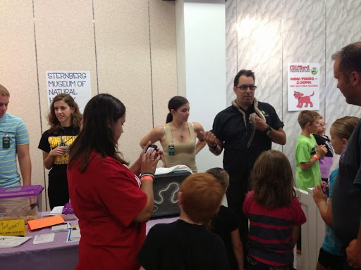 In the middle of September, the Sternberg Museum joined Smoky Hill Public Television (our local Western Kansas PBS station) in their Family Fun Day. Amid the children dragging their parents to booths to play games for prizes and have their pictures taken with beloved PBS characters, the Museum was able to set up a table showcasing extinct and extant animals from Kansas. The live animals are always a hit, and our Hognose snake (Chubs), Great Plains Ratsnake (Buddy), Common Snapping Turtle (Jeffery – don’t worry, kiddos, he doesn’t snap!), and mice with pinkies were no exception. Snakes will always stir up a mixed reaction from people, but by bringing mice and explaining how fast mice can reproduce (every 30 days!), we can present a convincing argument for the importance of snakes in the ecosystem. Overall, I think most kids were more scared of Clifford the Big Red Dog than of Buddy and Chubs.