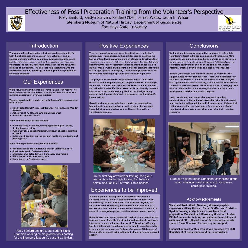 Natural history museums play an important role in science education – from fostering exploration of the natural world in children to encouraging life long learning in adults. Members of the Wilson Paleontology Lab not only plan and implement outreach activities at the Sternberg Museum, but lab members also work to safeguard museum resources, understand visitor experiences, and develop new educational opportunities. Students pursuing a museum studies emphasis work with paleontology staff in collections and the fossil prep lab to preserves specimens, data, and metadata; they work with the exhibits team to design new exhibits; they collaborate with education specialists to design and implement public programming; and they work with statisticians and marketing experts to understand visitor demographics and experiences. These projects not only benefit the Sternberg Museum and greater natural history museum community, but provide hands-on opportunities for students pursuing museum careers.